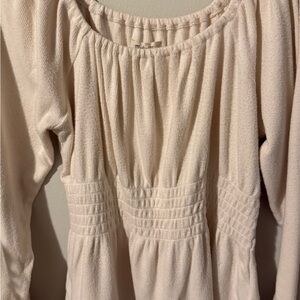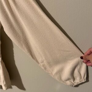 Chic cream blouse with gathered details. Long sleeves and square neckline. Ideal for versatile styling.