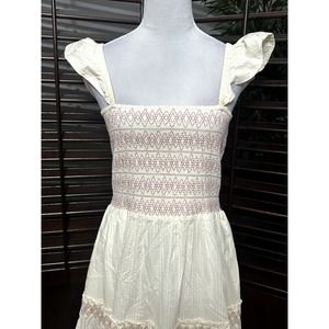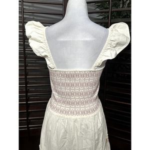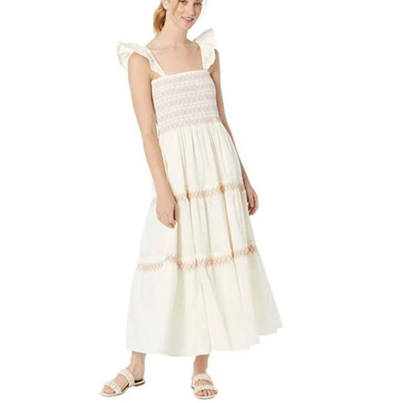 Elegant cream maxi dress by Madewell. Features ruffled straps and smocked bodice. Perfect for casual outings.