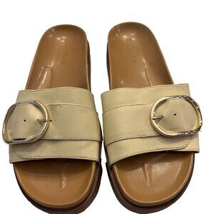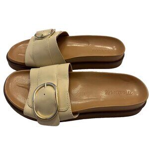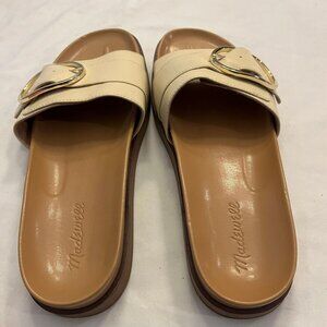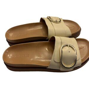 These Madewell sandals feature a sleek cream upper with a striking gold-tone accent, offering a modern and minimalist design. The comfortable tan footbed and light brown sole make them perfect for casual summer outings. Slip into these streamlined sandals for a chic and effortless look.