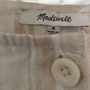 Chic cream blouse with subtle stripes. Features button-down front and puff sleeves. Perfect for casual wear. %100 linen.