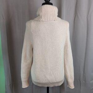 This Madewell sweater in a creamy shade offers a cozy turtleneck design with a substantial chunky knit texture. The ribbed detailing at the neck, cuffs, and hem adds a touch of classic elegance, while the relaxed fit ensures both comfort and style.