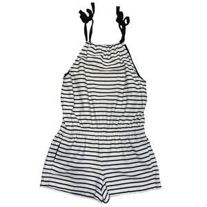 Women's Crew Neck Short Romper by Madewell, US Size S, Cream/Black with Striped pattern, Sleeveless, Crew Gathered neckline, Stretchy waist, Side Pockets, One Piece, Adjustable Straps, Good for Casual, Party, Date. One piece jumpsuit romper.