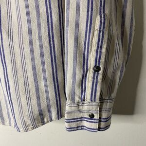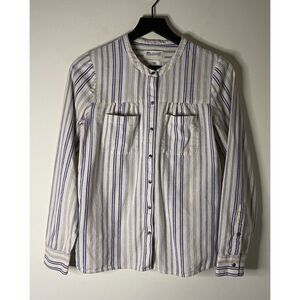 Cream and blue striped button down shirt from Madewell. Long sleeved. 100% cotton. Size S. Approximate flat lay measurements- Bust: 18” across from armpit to armpit. Length: 25”. Gently preowned condition with no tears or stains.