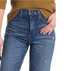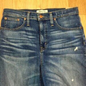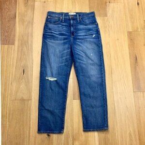 Ripped details add an edgy style to these relaxed fit straight leg jeans with a cropped fit.