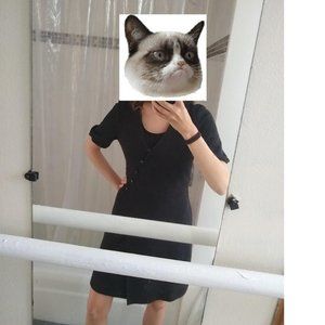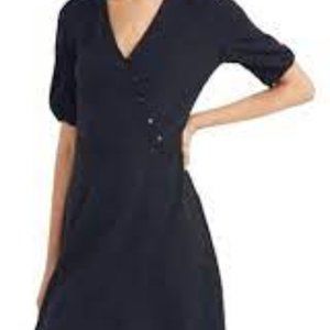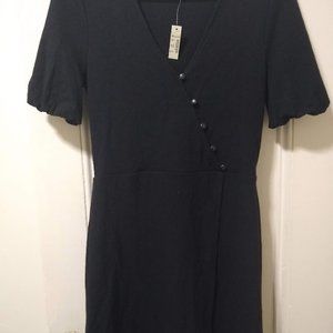 The fabric is textured, the dress is wrap-style with buttons in the front. The sleeves are elastic. Poly/rayon/elastane. I actually got this from Thredup but it arrived 'new with tags'. The dress is really comfortable just a little big on me (in the picture I'm wearing an undershirt so it's not too revealing) and I missed the time frame to return.