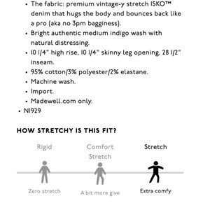 10 1/4" high rise, 10 1/4" skinny leg opening, 28 1/2" inseam.