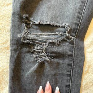 Well loved ripped madewell jeans in faded black. Note some rippling shown on front near zipper. Size 27P.