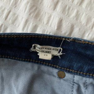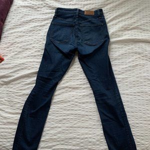 Blue denim wash curvy high-rise skinny jeans from Madewell. In great condition, no signs of wear other than slight unravel of back pocket seam (does not functionally affect the pocket, it is still sealed). Zipper was recently repaired by Madewell. Selling these because I do not wear them anymore, they are seriously great jeans! They fit true to size and are skinny at the ankle. Not cropped, I am 5'6'' and they hit right at the top of my sneaker.