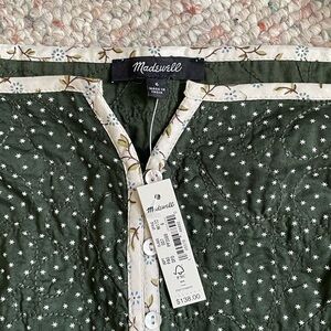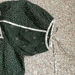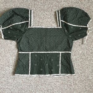 Chic puff sleeve top. Dark green with white polka dots. Square neckline. Delicate lace trim.