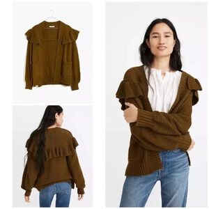 Madewell Dark Olive Green Ruffle Open Style 100% Cotton Knit Cardigan Sweater XS