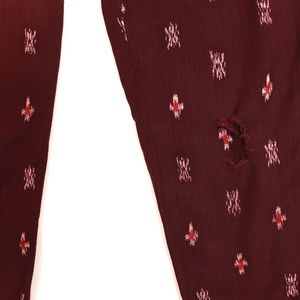 Madewell Delaney Slouch Trousers in Burgundy Ikat in Size 2. 100% Viscose. Selling AS-IS - has a few tears in fabric (knee area, and front near left pocket area.. could use repair - see pictures!. Instead of getting this done myself, I'm selling for a low price for the next owner to get fixed.