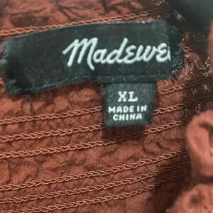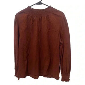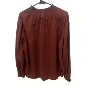 Trendy and cute blouse. Beautiful rich dark terracotta color. Swiss dot detail. Button accent to back.