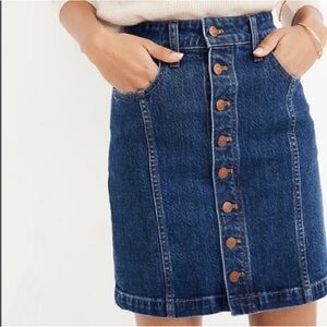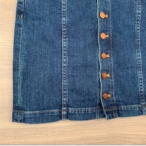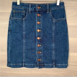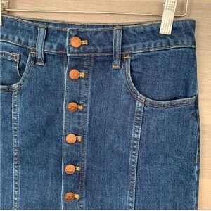 EUC dark blue denim button front skirt, mini length, straight fit and size 26. Pockets, belt loops, and fully functioning front button closure. Front and back seam detail. No visible flaws. Perfect for warm weather casual wear.