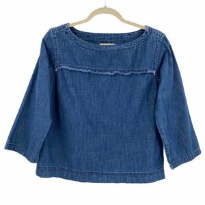 Features: frayed trim, 3/4 sleeves, boat neck, chambray material, blue.