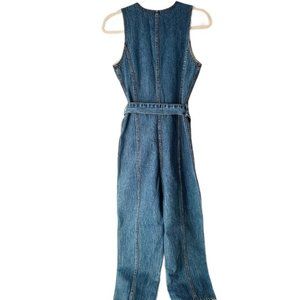 Made of 100% cotton denim, this button-front jumpsuit has a tie waist and seamed legs. Wear it on its own or layer it over a striped tee.