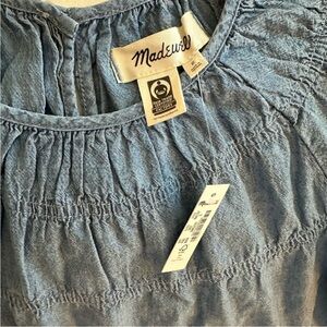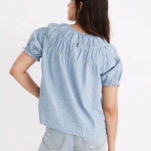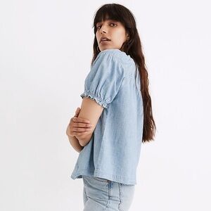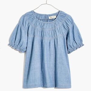 Made of lightweight denim, this superspecial top has a shirred crewneck and elastic puff sleeves for a dressed-up-tee vibe. Keep things laid-back with white jeans and your favorite sneaks.
