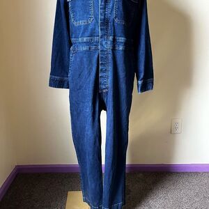 This is missing the size tag but it's a size 10. Fits slightly oversized. Buttons half way down. Long sleeves, wide leg. dark wash denim.