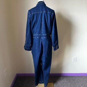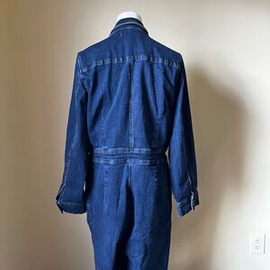 madewell denim jumpsuit, slim coverall, dark wash denim, button down utility suit, cotton stretch jumpsuit, blue jean boiler suit, casual denim one piece, workwear inspired, 70s style jumpsuit, boho minimalist outfit, long sleeve jumpsuit, wide leg denim, vintage inspired coverall, womens denim jumpsuit, soft stretch denim, everyday casual denim look, madewell jeans jumpsuit, modern vintage style