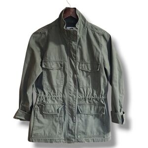 Madewell dispatch utility military jacket in the color olive green, size XS. Features: snap pockets, boxy fit, and adjustable inner drawstring. In great preloved condition. No flaws seen. 100% cotton.