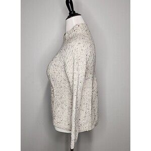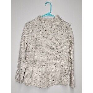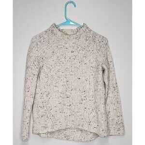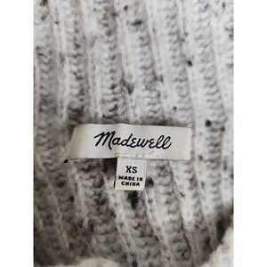 This Madewell sweater is a beige Donegal Northfield Mockneck style, featuring an oversized fit made from knit fabric. The sweater has long sleeves and a pullover design, with a mock neck neckline, giving it a chic and cozy look. This XS size sweater is perfect for women looking for a stylish and comfortable option to stay warm in cooler weather.