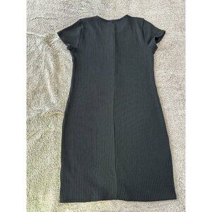 This is a Madewell dress in size M, featuring a button front and ribbed knit design in black. Made from a blend of cotton, polyester, and elastane, this mini dress has a round neckline, short sleeves, and a solid pattern. Ideal for travel or casual wear in the summer or spring, it offers stretch for comfort and is machine washable. The classic 90s style dress is suitable for women and was manufactured in Vietnam.