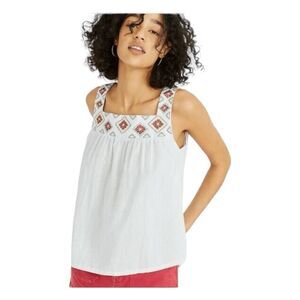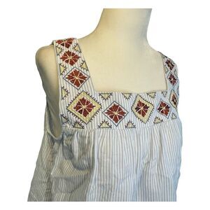 Madewell Embroidered Island Striped Tank Top. Breezy Lightweight Cotton, this Swingy Blue and White Striped tank has a pretty Blue, Rust and Gold Aztec Design Embroidered Neckline. It has a slightly cropped fit and great for casual days at work, school, date night, night out with the girls, and Family Dinner. It would make a great Christmas Hanukkah Valentine’s Day Birthday or any Holiday gift!