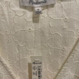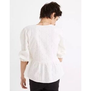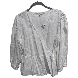 New With Tags! Madewell Embroidered Eyelet Puff Sleeve Peplum Wrap Top Blouse. Ivory color. Size Medium. Three-quarter puff sleeves have elastic in the cuff so you can wear them pushed up or down. Faux-Wrap style shirt has hidden clasps and ties off to one side. Beautiful floral eyelet woven cotton. 100% cotton.