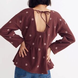 Madewell Embroidered Lightspun Peplum Open-Back Top, size S, Vintage Mulberry