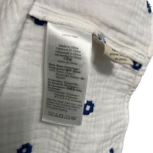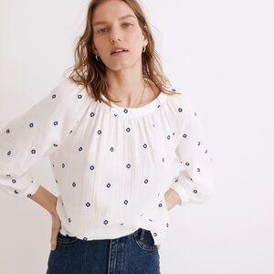 Madewell Embroidered Lightspun Wide Neck Cuffed Sleeve Top. Double layered cotton gauze fabric. White shirt with blue embroidered detail. Vintage pattern. Drapey top. Wide collar neckline. Cuffed three quarter sleeves. Regular fit. Buttons down the back.