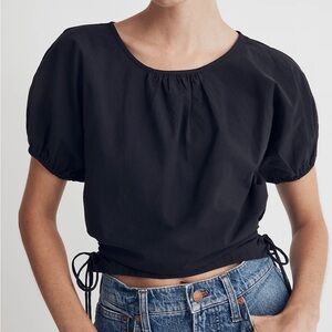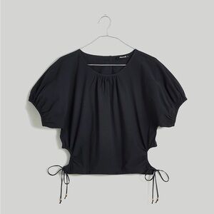 Madewell Embroidered Poplin Puff-Sleeve Cutout Crop Top in True Black NWT