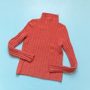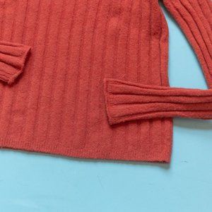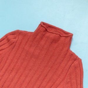 Features: Rust deep orange long sleeve high turtleneck pullover sweater with ribbed textured stripe pattern throughout. Wool Alapaca blend knit fabric.