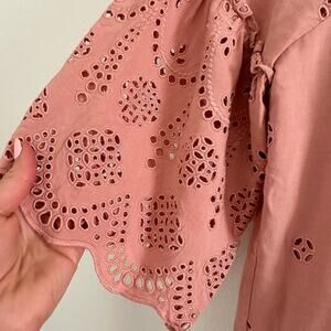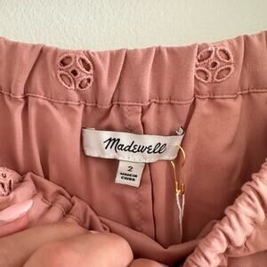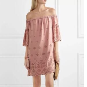 Details: Madewell Eyelet Off The Shoulder Scalloped Hem Short Sleeve Mini Dress- Size: 2- Color: Mauve Pink- Material: 70% Viscose, 30% Lyocell- Features: Eyelet, off the shoulder, scalloped hem, short sleeve, comfort, breathable, casual. G3057