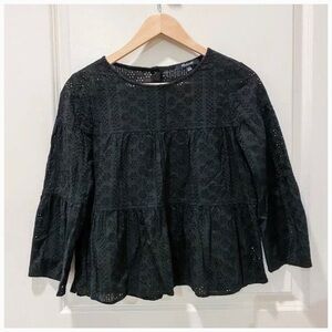 A flowy eyelet top in a pretty tiered silhouette with a fresh button-back detail. So good with jeans (no surprise there) and perfect for all of those upcoming holiday parties. True to size.