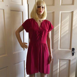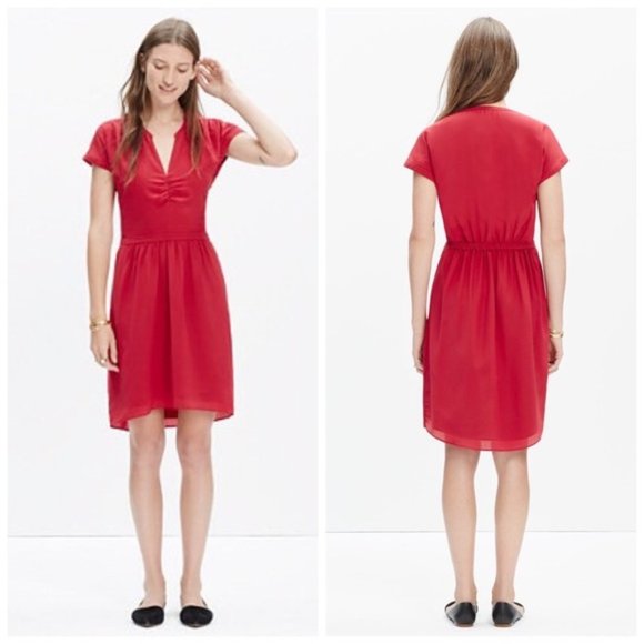 Gorgeous, soft 100% silk dress in a deep red by Madewell. V neck with ruching down the front bodice and along the shoulder seams. Pullover with elastic on the back waistband. Skirt is lined.