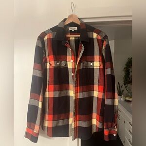 Stylish plaid button-up shirt with a classic design. Features a mix of red, black, and cream colors.