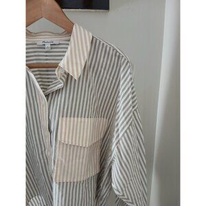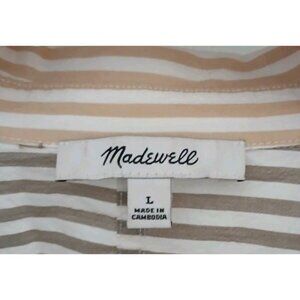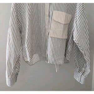Madewell Flap-Pocket Crop Button-Up Shirt in Cotton Poplin. Size Large. White with gray stripes. Style NP026 from 2024. In nice, preowned condition. No flaws noted. Measures 24" pit to pit, 22" shoulder to hem.