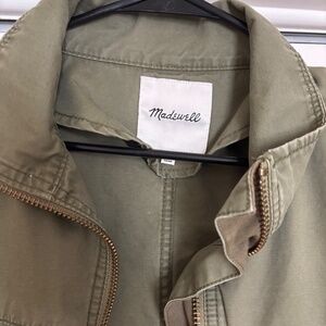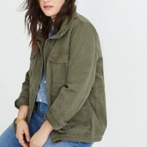 A streamlined military-inspired style with clean lines, a stand-up collar, zip pockets and a waist-defining drawstring.