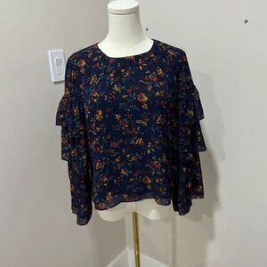 Chic floral blouse by Madewell. Features navy base with vibrant orange floral pattern. Flowy sleeves add elegance. Enjoyed it and am now ready to make room for something “new”!