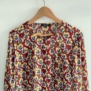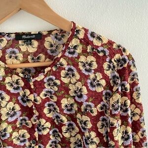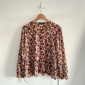 Stylish floral blouse by Madewell. Features a burgundy base with cream and yellow flowers. V-neckline and long sleeves.