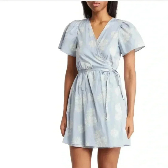 A delicate floral print breathes summery vibes into this wrap minidress made from lightweight cotton and charmed by short puff sleeves.