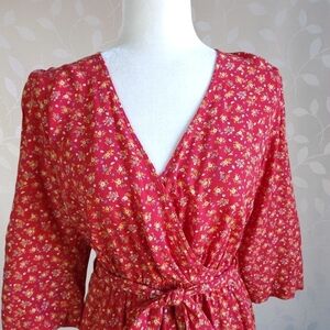 This effortlessly chic Madewell romper features a flattering faux wrap design with a tie waist, flowy shorts, and a vibrant red floral print. Lightweight and breezy — perfect for warm weather, brunch dates, or weekend getaways. Flattering and feminine with a casual twist.