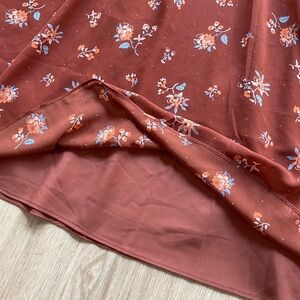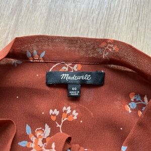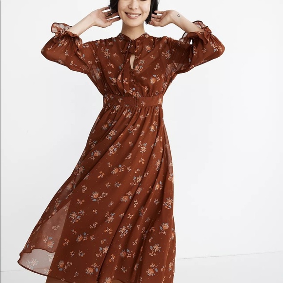 Madewell Midi Dress. called the “Georgette Tie-Neck Midi Dress in Forest Floral”. brown with a floral print. puff sleeves, prairie vibes. ties at the neck. in great condition!