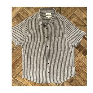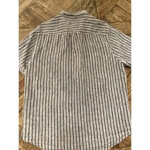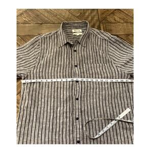 Stylish gray button-down shirt with black stripes. Perfect for casual wear. Comfortable and versatile.