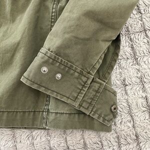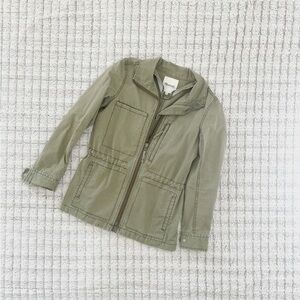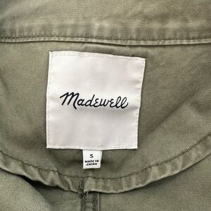 Madewell Green Fleet Jacket in size Small. This classic utility-style jacket features a timeless design with a soft, lightweight fabric, perfect for layering year-round. Details include a zip-up front with snap closures, multiple pockets for functionality, and an adjustable drawstring waist for a flattering fit. Gently used and in excellent condition. A versatile piece for casual and chic outfits!