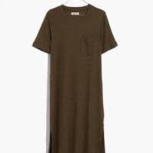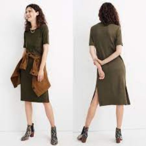 This Madewell dress features a classic sheath style in a versatile green hue, perfect for both casual and work settings. With its short sleeves and crew neck, it offers a comfortable fit and a polished look. The midi length adds a touch of elegance, making it a staple piece for any wardrobe.