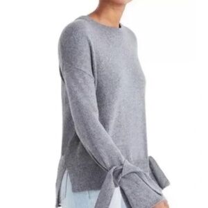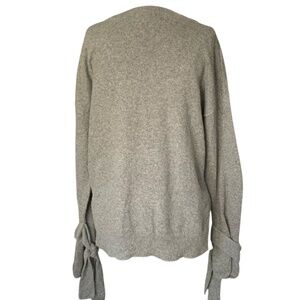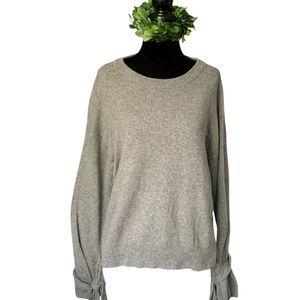 Madewell Grey tie cuff boxy pullover crew neck long sleeve sweater. Size medium. Heather grey cotton blend soft fabric- no itching. Wide loose sleeves with self knit tie at cuffs. Oversized drapey, boxy fit. Ribbed knit detail at side seams. Notch opening at side hem. Dropped shoulders. Color is a true grey. The stock photos are there for fit, but look more blue than