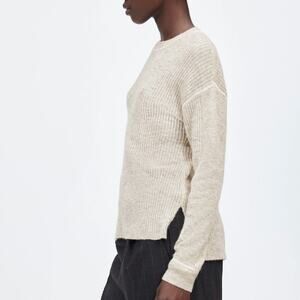 new without tags “heather stone” (light gray with light tan undertones) ribbed alpaca blend lightweight crewneck sweater from Madewell. split hem. style #NT578. 62% alpaca 38% polyamide.