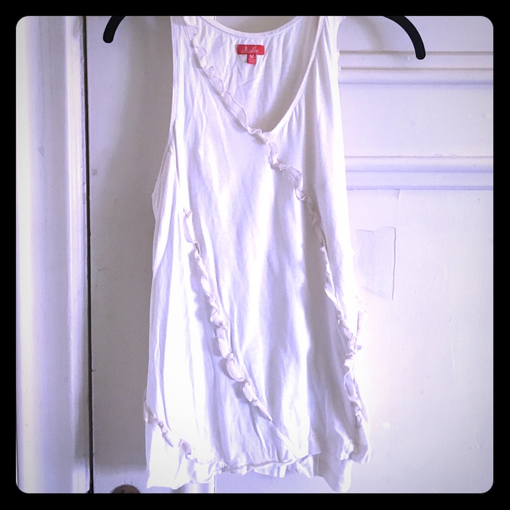 Madewell v-neck flowy tank. Off-white. Has subtle ruffled details. The hem at the bottom has come slightly undone but can be easily fixed/is not noticeable, especially if you wear it tucked in.