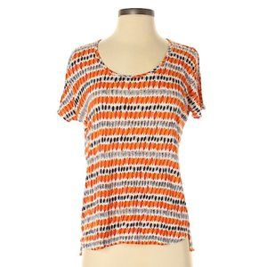 Red, orange, grey, and black printed t-shirt. Scoop neck. Rayon linen blend.