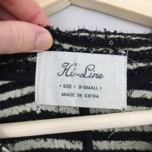 Madewell Hi-Line sequin zip up cardigan size XS. Scoop neck, fabric is a tan background with black metallic fringe embedded with black sequin. Has front pockets. 64% Polyester 34% Rayon 2% Metallic.